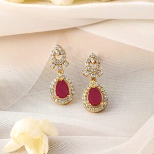 This elegant 22K gold-plated necklace set showcases ruby red stones and cubic zirconia, offering a timeless design adorned with intricate detailing and a radiant finish. Material & Care Dimension : Length : Necklace : 13 cm Earrings : 2.3 cm Width : Necklace : 4 cm Earrings : 1 cm Material: Brass Net Weight: 22.48 Gram Net Quantity: 1 Necklace & 1 Pair of Earrings Care Label: It is advisable to avoid contact with water and organic chemicals i.e. perfume sprays. Store jewellery in airtight box. After use, wipe the jewellery with soft cotton cloth.