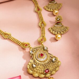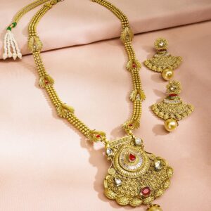 This handcrafted long necklace set features an antique temple pendant with ruby red stones and pearl drops, perfectly designed for festive and wedding occasions for women. Material & Care Dimension : Length : Necklace : 34 cm Earrings : 6.5 cm Dimension : Width : Necklace : 4 cm Earrings : 6 cm Plating : Gold Plated Material : Brass Net Weight : 118.46 Gram Net Quantity : 1 Necklace & 1 Pair of Earrings Care Label : It is advisable to avoid contact with water and organic chemicals i.e. perfume sprays. Store jewellery in airtight box. After use, wipe the jewellery with sof