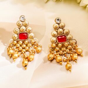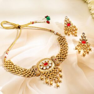 22K gold-plated choker jewellery set featuring ruby red and white kundan stones, enhanced with cascading golden beads—perfect for weddings and festive occasions for women. Occasion : Bring your style to a whole new level with this handcrafted piece of jewellery. When you’re celebrating a special Occasion : – a birthday, wedding, festive or personal milestone – this piece adds that extra something that makes us feel special and looking our best. Material & Care Dimension : Length : Necklace: 15 cm; Earrings: 5.5 cm Dimension : Width : Necklace: 3.5 cm; Earrings: 3 cm Collection : Rajwadi Gold Material: Brass Net Weight: 63.96 Gram Net Quantity: 1 Necklace & 1 Pair of Earrings Care Label: It is advisable to avoid contact with water and organic chemicals i.e. perfume sprays. Store jewellery in airtight box. After use, wipe the jewellery with soft cotton cloth.