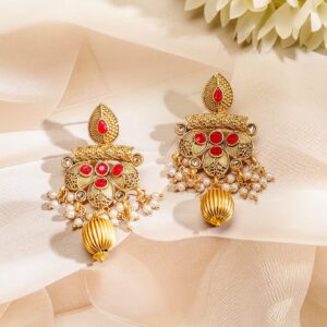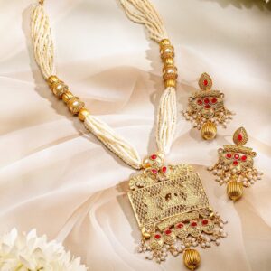This stunning 22K gold-plated jewellery set features a traditional temple motif pendant adorned with ruby accents and delicate white pearls. The multi-layered pearl beads complement the intricate design of the pendant and matching earrings, creating an elegant and regal look perfect for any special occasion. Occasion : Bring your style to a whole new level with this handcrafted piece of jewellery. When you’re celebrating a special Occasion : – a birthday, wedding, festive or personal milestone – this piece adds that extra something that makes us feel special and looking our best. Material & Care Dimension : Necklace – 29 cm ,Earrings – 7 cm Collection : Gold Tone Material: Brass Net Weight: 56 Gram Net Quantity: 1 Necklace & 1 Pair of Earrings Care Label: It is advisable to avoid contact with water and organic chemicals i.e. perfume sprays. Store jewellery in airtight box. After use, wipe the jewellery with soft cotton cloth.