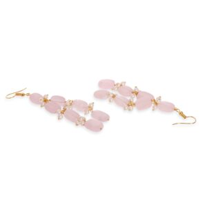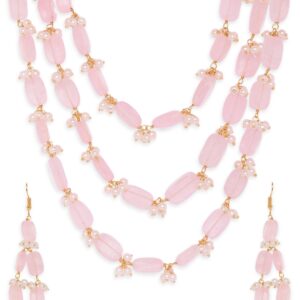 Elevate your elegance with this “22K Gold Plated Semi-Precious Rose Quartz Gem Beaded Zirconia Studded Multilayer Statement Necklace Set.” Meticulously crafted, this set features lustrous rose quartz gem beads, each adorned with sparkling zirconia stones, set in radiant 22K gold plating. The multi-layered design adds depth and opulence to your attire, making it ideal for special occasions. The coordinating necklace and earrings create a harmonious ensemble that exudes luxury and sophistication. Elevate your style with this exquisite jewelry set, which combines the natural beauty of rose quartz with the brilliance of expert craftsmanship to create a stunning statement piece. Material & Care Dimension : Necklace : 56 cm Earrings : 9 cm Material : Brass Weight : 103.61g Net Qnty : 1 Necklace, 1 Pair of Earrings Care Label : It is advisable to avoid contact with water and organic chemicals i.e. perfume sprays. Store jewellery in airtight box. After use, wipe the jewellery with soft cotton cloth.