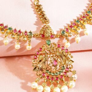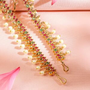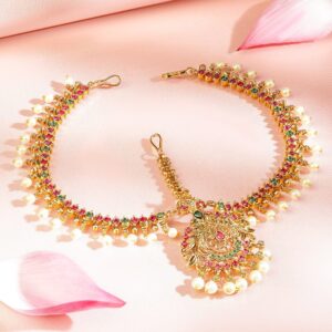 Crafted in 22K gold plating, this bridal matha patti features a majestic goddess-inspired motif surrounded by ruby red and emerald green stones and bordered with white pearl drops. A regal headpiece for women & girls for weddings and festive events. Occasion : Bring your style to a whole new level with this handcrafted piece of jewellery. When you’re celebrating a special Occasion : – a birthday, wedding, festive or personal milestone – this piece adds that extra something that makes us feel special and looking our best. Material & Care Dimension : Length : 19 cm, Width: 3 cm Net Weight: 37.13 Gram Net Quantity : 1 Head Jewellery Material : Brass Care Label : It is advisable to avoid contact with water and organic chemicals i.e. perfume sprays. Store jewellery in airtight box. After use, wipe the jewellery with soft cotton cloth.