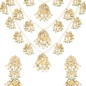 The layered design exudes regal elegance and sophistication, perfect for enhancing your style. Embrace the captivating allure of this set, allowing the pearls and Kundan embellishments to grace your ensemble with a touch of refined beauty. Let the 22K gold plating and intricate craftsmanship create an aura of timeless charm and exquisite allure, making a statement of majestic grandeur and luxurious charm. Material & Care Dimension : Necklace : 68 cm Earrings : 9 cm Material: Brass Net Weight: 156,78 Gram Net Quantity: 1 Necklace & 1 Pair of Earrings Care Label: It is advisable to avoid contact with water and organic chemicals i.e. perfume sprays. Store jewellery in airtight box. After use, wipe the jewellery with soft cotton cloth.