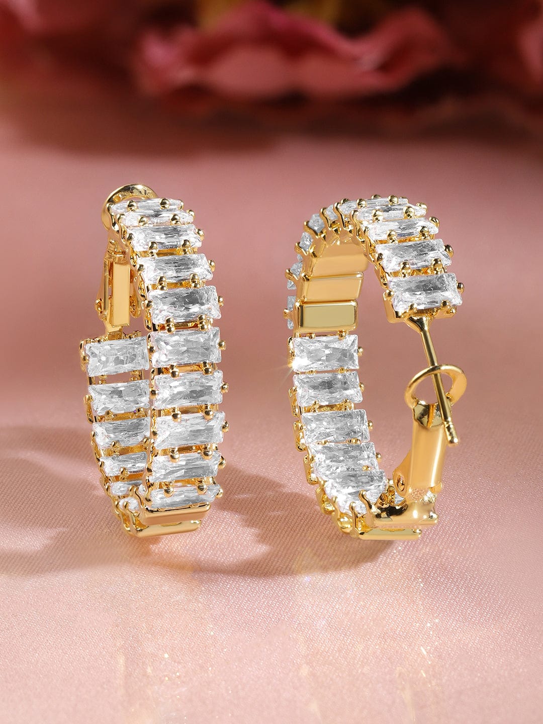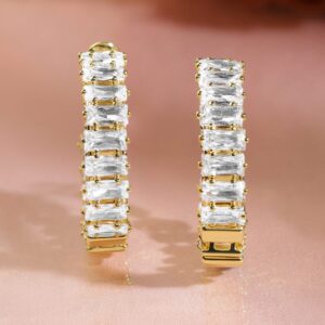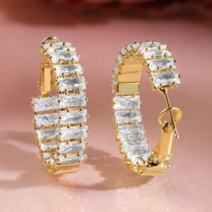 Earrings : These 22K gold-plated hoop earrings are studded with white baguette-cut cubic zirconia, offering a sleek and sparkling look – ideal for parties, formal events, or everyday elegance. Occasion : Bring your style to a whole new level with this handcrafted piece of jewellery. When you’re celebrating a special Occasion : – a birthday, wedding, parties or personal milestone – this piece adds that extra something that makes us feel special and looking our best. Material : & Care Dimension : Length : 2.5 cm, Width: 0.6 cm Net Weight: 9.89 g Net Quantity : 1 Pair Of Earrings Material :Brass Plating : Gold Plated Care Label : It is advisable to avoid contact with water and organic chemicals i.e. perfume sprays. Store jewellery in airtight box. After use, wipe the jewellery with soft cotton cloth.