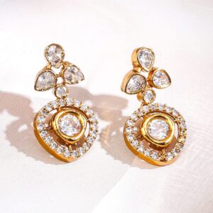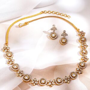 This 22K gold-plated floral vine necklace set features handcrafted detailing and white Cubic Zirconia stones, making it an elegant choice for festive celebrations and grand traditional occasions. Perfect for Occasions: Ideal for festive events, weddings, and traditional gatherings, this necklace set pairs beautifully with lehengas, sarees, and anarkalis for a show-stopping ethnic look. Material & Care Dimension : Length – Necklace : 22.4 cm ; Earrings : 1.4 cm Width – Necklace : 2.5 cm ; Earrings : 2.5 cm Material : Brass Collection : Gold with AD/ Cubic Zirconia Weight : 24.81 Gram Net Qnty : 1 Necklace & 1 Pair of Earrings Care Label : It is advisable to avoid contact with water and organic chemicals i.e. perfume sprays. Store jewellery in airtight box. After use, wipe the jewellery with soft cotton cloth.