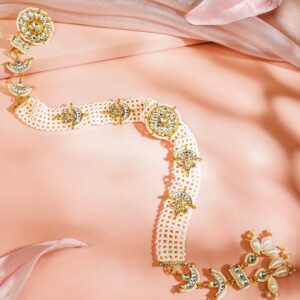 Hair Accessory : This handcrafted 22K gold-plated head jewellery features white kundan stones, cream pearl beads, and crescent motifs with teardrop pearls. Designed for women, it’s perfect for bridal and bridesmaid styling during weddings and festive ceremonies. Occasion : Bring your style to a whole new level with this handcrafted piece of jewellery. When you’re celebrating a special Occasion : – a birthday, wedding, parties or personal milestone – this piece adds that extra something that makes us feel special and looking our best. Material & Care Dimension : Length : 50 cm, Width: 3.5 cm Net Weight: 55.46 gram Net Quantity : 1 Hair Accessory Material : Brass Care Label : It is advisable to avoid contact with water and organic chemicals i.e. perfume sprays. Store jewellery in airtight box. After use, wipe the jewellery with soft cotton cloth.