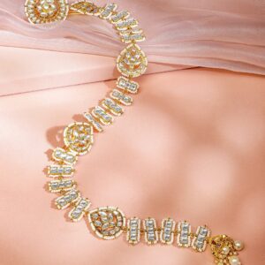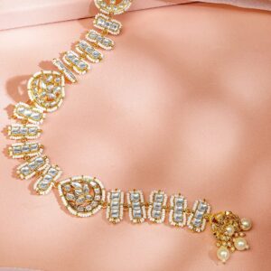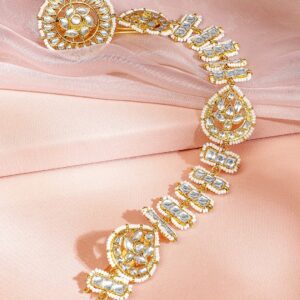 Hair Accessory : This 22K gold-plated handcrafted head jewellery features white kundan stones and cream pearl bead drops in an elegant floral design. Designed for women, perfect for bridal and bridesmaid wear at weddings, sangeet, and festive celebrations. Occasion : Bring your style to a whole new level with this handcrafted piece of jewellery. When you’re celebrating a special Occasion : – a birthday, wedding, parties or personal milestone – this piece adds that extra something that makes us feel special and looking our best. Material & Care Dimension : Length : 36 cm, Width: 4 cm Net Weight: 68.9 gram Net Quantity : 1 Hair Accessory Material : Brass Care Label : It is advisable to avoid contact with water and organic chemicals i.e. perfume sprays. Store jewellery in airtight box. After use, wipe the jewellery with soft cotton cloth.