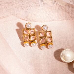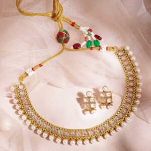 This 22K gold-plated handcrafted jewelry set features white Kundan stones beautifully studded in a classic design. The necklace is elegantly bordered with pearl beads, adding a touch of sophistication. Paired with matching earrings, this set is perfect for a graceful look. Occasion : Bring your style to a whole new level with this handcrafted piece of jewelry. When you’re celebrating a special Occasion : – a birthday, wedding, festive or personal milestone – this piece adds that extra something that makes us feel special and looking our best. Material : & Care Dimension : Length : Necklace : 18 cm; Earrings 2.2 cm Width : Necklace : 1.5 cm; Earrings : 1.5 cm Material: Brass Net Weight: 31.62 Gram Net Quantity: 1 Necklace & 1 Pair of Earrings Care Label: It is advisable to avoid contact with water and organic chemicals i.e. perfume sprays. Store jewellery in airtight box. After use, wipe the jewellery with soft cotton cloth.