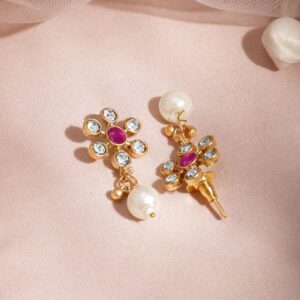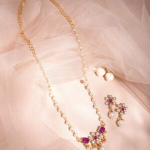 Jewellery Set : This 22K gold-plated necklace set features elegant pearl beads paired with a striking Ruby Pink and Cubic Zirconia studded pendant. The intricate design is complemented by matching earrings, adding a touch of sophistication to any traditional or modern look. Occasion : Bring your style to a whole new level with this handcrafted piece of jewellery. When you’re celebrating a special Occasion : – a birthday, wedding, or personal milestone – this piece adds that extra something that makes us feel special and looking our best. Material : & Care Dimension : Length : 21/3.5, Width: 3/1 Net Quantity : 1 Necklace & 2 Earrings Net Weight: 46.27 Material :Brass Care Label : It is advisable to avoid contact with water and organic chemicals i.e. perfume sprays. Store jewellery in airtight box. After use, wipe the jewellery with soft cotton cloth.