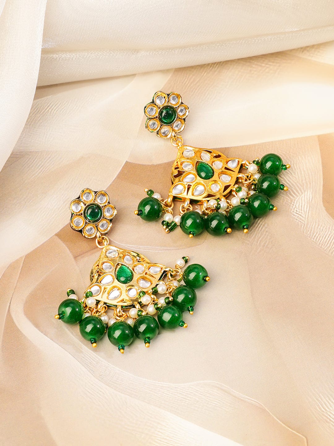 Jewellery Set : This 22K Gold-Plated handcrafted necklace set features multi-strand white pearl beads with kundan detailing and emerald green beads. A grand and elegant pick for bridal and festive occasions. Occasion : Bring your style to a whole new level with this handcrafted piece of jewellery. When you’re celebrating a special Occasion : – a birthday, wedding, or personal milestone – this piece adds that extra something that makes us feel special and looking our best. Material & Care Dimension : Length Size : Necklace : 16 cm, Earrings : 6 cm Dimension : Width Size : Necklace : 3 cm, Earrings : 3 cm Net Quantity : 1 Necklace & 1 Pair of Earrings Net Weight: 60.94 Gram Material : Brass Care Label : It is advisable to avoid contact with water and organic chemicals i.e. perfume sprays. Store jewellery in airtight box. After use, wipe the jewellery with soft cotton cloth.