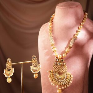 This 22K gold-plated necklace set features pearl beads and intricate green and red stone accents. Paired with matching earrings, this handcrafted set offers a rich and traditional appeal. Occasion : Bring your style to a whole new level with this handcrafted piece of jewellery. When you’re celebrating a special Occasion : – a birthday, wedding, festive or personal milestone – this piece adds that extra something that makes us feel special and looking our best. Material & Care Dimension : Length : Necklace – 60 cm earrings – 6.6 cm Material : Brass Care Label : It is advisable to avoid contact with water and organic chemicals i.e. perfume sprays. Store jewellery in airtight box. After use, wipe the jewellery with soft cotton cloth.