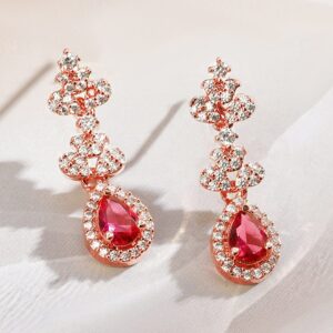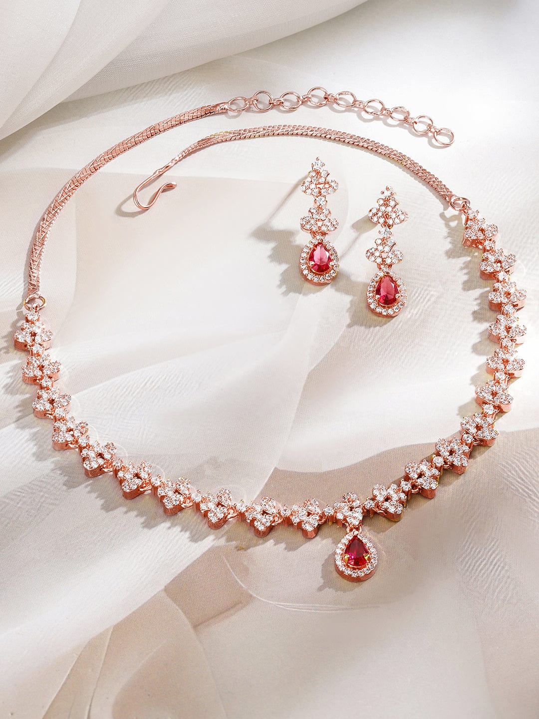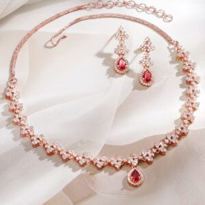 This 22K rose gold-plated brass necklace set features ruby pink teardrop and white cubic zirconia stones with matching earrings—ideal for parties, festive celebrations, and elegant special occasions. Occasion Styling: Ideal for festive gatherings, evening parties, cultural events, and special occasions. The modern classic design complements everything from elegant sarees to gowns and cocktail dresses. Material & Care Dimension : Length : Necklace: 10 cm ; Earrings : 1 cm Dimension : Width : Necklace : 3 cm ; Earrings: 1 cm Material : Brass Net Weight : 22.71 Gram Net Quantity : 1 Necklace & 1 Pair of Earrings Care Label : It is advisable to avoid contact with water and organic chemicals i.e. perfume sprays. Store jewellery in airtight box. After use, wipe the jewellery with soft cotton cloth
