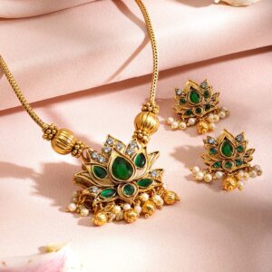 Jewellery Set: One of the most versatile forms of ornate designs that goes well with every style and personality. Wear one of these and you do not have to worry about any other accessory. Occasion : Bring your style to a whole new level with this handcrafted piece of jewellery. When you’re celebrating a special Occasion : – a birthday, wedding, or personal milestone – this piece adds that extra something that makes us feel special and looking our best. Material : & Care Dimension :Size : Necklace : 19 cm, Earrings : 4 cm Material: Brass Net Weight: 49.11 Gram Net Quantity: 1 Necklace & 1 Pair of Earrings Care Label: It is advisable to avoid contact with water and organic chemicals i.e. perfume sprays. Store jewellery in airtight box. After use, wipe the jewellery with soft cotton cloth.