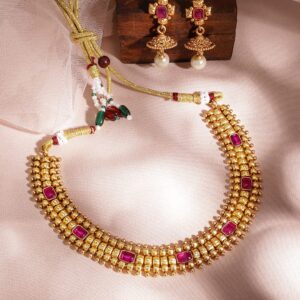 Jewellery Set: One of the most versatile forms of ornate designs that goes well with every style and personality. Wear one of these and you do not have to worry about any other accessory. Occasion : Bring your style to a whole new level with this handcrafted piece of jewellery. When you’re celebrating a special Occasion : – a birthday, wedding, or personal milestone – this piece adds that extra something that makes us feel special and looking our best. Material : & Care Material :Brass Net Weight: 39.1 Gram Net Quantity: 1 Necklace & 1 Pair of Earrings Care Label: It is advisable to avoid contact with water and organic chemicals i.e. perfume sprays. Store jewellery in airtight box. After use, wipe the jewellery with soft cotton cloth.