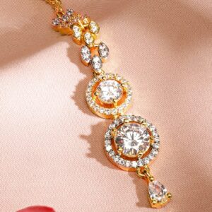 Head Jewellery : Discover the elegance of 22KT Gold-Plated Cubic Zirconia & American Diamond Maang Tikka Head Jewellery. This piece combines quality craftsmanship with a timeless design, making it perfect for any occasion. Elevate your style effortlessly and enjoy compliments on your refined taste. A must-have addition to your jewelry collection. Occasion : Bring your style to a whole new level with this handcrafted piece of jewellery. When you’re celebrating a special Occasion : – a birthday, wedding, or personal milestone – this piece adds that extra something that makes us feel special and looking our best. Material : & Care Dimension : Head Jewellery Size :Length : 14 cm, Width : 1.3 cm Material :Alloy Care Label : It is advisable to avoid contact with water and organic chemicals i.e. perfume sprays. Store jewellery in airtight box. After use, wipe the jewellery with soft cotton cloth.