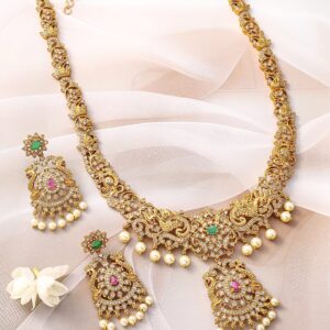 Necklace Set : Discover elegance with the Gold-Plated design, meticulously crafted for those who cherish luxury. This piece features precious stones for an eye-catching sparkle, making it perfect for special occasions. With a blend of high-quality materials and exquisite design, it promises both durability and style. The versatile look can complement a variety of outfits, adding a touch of sophistication. A must-have for enhancing your accessory collection with timeless elegance. Occasion : Bring your style to a whole new level with this handcrafted piece of jewellery. When you’re celebrating a special Occasion : – a birthday, wedding, or personal milestone – this piece adds that extra something that makes us feel special and looking our best. Material : & Care Dimension : Length : 35 cm / 1.5 cm, Width: 4.5 cm / 2 cm Material: Brass Net Weight: 150 Gram Net Quantity: 1 Necklace & 1 Pair of Earrings Care Label: It is advisable to avoid contact with water and organic chemicals i.e. perfume sprays. Store jewellery in airtight box. After use, wipe the jewellery with soft cotton cloth.