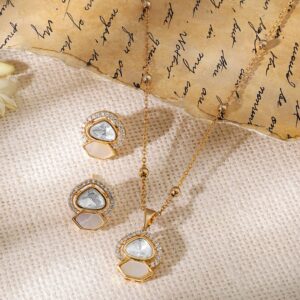 Jewellery Set: One of the most versatile forms of ornate designs that goes well with every style and personality. Wear one of these and you do not have to worry about any other accessory. Occasion : Bring your style to a whole new level with this handcrafted piece of jewellery. When you’re celebrating a special Occasion : – a birthday, wedding, or personal milestone – this piece adds that extra something that makes us feel special and looking our best. Material : & Care Dimension :Size : Necklace : 17 cm, Earrings : 1.5 cm Material :Brass Weight : 11.58g Net Qnty : 1 Necklace, 1 Pair of Earrings Care Label : It is advisable to avoid contact with water and organic chemicals i.e. perfume sprays. Store jewellery in airtight box. After use, wipe the jewellery with soft cotton cloth.