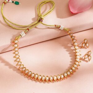 Jewellery Set: One of the most versatile forms of ornate designs that goes well with every style and personality. Wear one of these and you do not have to worry about any other accessory. Occasion : Bring your style to a whole new level with this handcrafted piece of jewellery. When you’re celebrating a special Occasion : – a birthday, wedding, festive or personal milestone – this piece adds that extra something that makes us feel special and looking our best. Material & Care Dimension :Size : Necklace : 21 cm, Earrings : 1 cm Material : Brass Care Label : It is advisable to avoid contact with water and organic chemicals i.e. perfume sprays. Store jewellery in airtight box. After use, wipe the jewellery with soft cotton cloth.