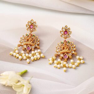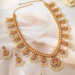 Jewellery Set : Adorned with intricate Lakshmi motifs, ruby stones, and pearl accents, this 24K gold-plated temple necklace set exudes timeless elegance and grandeur. Occasion : Bring your style to a whole new level with this handcrafted piece of jewellery. When you’re celebrating a special Occasion : – a birthday, wedding, or personal milestone – this piece adds that extra something that makes us feel special and looking our best. Material : & Care Dimension : Length : 25 cm / 5.5 cm, Width: 4.5 cm / 1.8 cm Net Weight: 138.26 g Net Quantity : 1 Necklace & 2 Earrings Material :Brass Care Label : It is advisable to avoid contact with water and organic chemicals i.e. perfume sprays. Store jewellery in airtight box. After use, wipe the jewellery with soft cotton cloth.