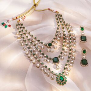 Jewellery Set : 24K gold-plated brass multi-layer bridal necklace set with emerald green stones and AAA cubic zirconia, designed for weddings, receptions, and festive occasions. Occasion Perfect: Ideal for weddings, receptions, festive events, and royal celebrations, adding grandeur to any bridal attire. Material : & Care Dimension : Length Size : Necklace : 22 cm, Earrings : 2.5 cm Width Size : Necklace : 4.5 cm, Earrings : 2.5 cm Net Quantity : 1 Necklace & 2 Earrings Net Weight: 133.07 Gram Material : Brass Care Label : It is advisable to avoid contact with water and organic chemicals i.e. perfume sprays. Store jewellery in airtight box. After use, wipe the jewellery with soft cotton cloth.