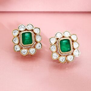 Jewellery Set : This exquisite 24K gold-plated choker necklace set by showcases a timeless design with an emerald green centerpiece surrounded by white kundan stones. Paired with matching floral stud earrings, this set offers an elegant and luxurious appeal, perfect for making a sophisticated statement. Occasion : Bring your style to a whole new level with this handcrafted piece of jewellery. When you’re celebrating a special Occasion : – a birthday, wedding, or personal milestone – this piece adds that extra something that makes us feel special and looking our best. Material : & Care Dimension : Length : NS- 19 ; E- 2.5 cm, Width: NS- 2.5 ; E- 1 W Net Weight: 58.86 g Net Quantity : 1 Necklace & 2 Earrings Material :Brass Care Label : It is advisable to avoid contact with water and organic chemicals i.e. perfume sprays. Store jewellery in airtight box. After use, wipe the jewellery with soft cotton cloth.