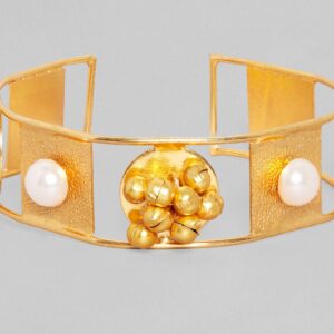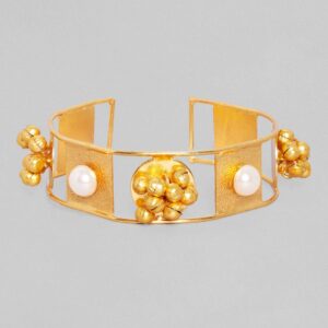 This season, all you need to stand out is an exquisite band bracelet with an adjustable feature and a contemporary design. This one is made specifically for you to slay the style with geometric components like square and a circle, as well as a combination of golden beads and pearls this is the best fashion of the ethnic as well as the chic looks. it is fit for the queens! Occasion : Bring your style to a whole new level with this handcrafted piece of jewellery. When you’re celebrating a special Occasion : – a birthday, wedding, or personal milestone – this piece adds that extra something that makes us feel special and looking our best. Material & Care Dimension : Adjustable Collection : Gold Tone Material: Brass Net Weight: 30 Gram Net Quantity: 1 Bracelet Care Label: It is advisable to avoid contact with water and organic chemicals i.e. perfume sprays. Store jewellery in airtight box. After use, wipe the jewellery with soft cotton cloth.