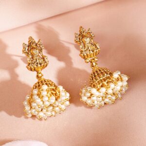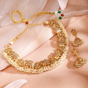 Jewellery Set : This 24K gold-plated divine Lakshmi temple choker set features intricately crafted elephant motifs and Goddess Lakshmi detailing, adorned with clusters of white pearl beads, making it a majestic and traditional piece for weddings and festive occasions. Occasion : Bring your style to a whole new level with this handcrafted piece of jewellery. When you’re celebrating a special Occasion : – a birthday, wedding, or personal milestone – this piece adds that extra something that makes us feel special and looking our best. Material : & Care Dimension : Size : Necklace : 35 cm, Earrings : 4 cm Net Quantity : 1 Necklace & 2 Earrings Net Weight: 52 g Material :Brass Care Label : It is advisable to avoid contact with water and organic chemicals i.e. perfume sprays. Store jewellery in airtight box. After use, wipe the jewellery with soft cotton cloth.