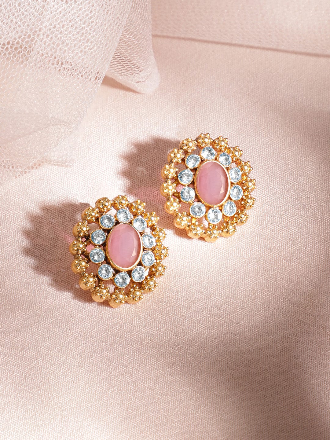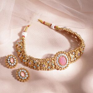 This handcrafted choker set from features a 24K gold plating adorned with pastel pink and white Cubic Zirconia stones. Its intricate & luxurious finish offer a perfect blend of tradition look. Occasion : Bring your style to a whole new level with this handcrafted piece of jewellery. When you’re celebrating a special Occasion : – a birthday, wedding, or personal milestone – this piece adds that extra something that makes us feel special and looking our best. Material : & Care Dimension : Length : 19 cm, Width : 2 cm Material: Brass Net Weight: 45.7 Gram Net Quantity: 1 Necklace & 1 Pair of Earrings Care Label: It is advisable to avoid contact with water and organic chemicals i.e. perfume sprays. Store jewellery in airtight box. After use, wipe the jewellery with soft cotton cloth.