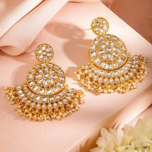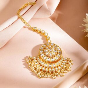 Jewellery Set : This jewellery set consists of a pair of earrings and a maang tikka Gold-Plated kundan stone drop earrings, each secured with a post-and-back closure A matching gold-plated maang tikka, secured with a hook closure Occasion : Bring your style to a whole new level with this handcrafted piece of jewellery. When you’re celebrating a special Occasion : – a birthday, wedding, or personal milestone – this piece adds that extra something that makes us feel special and looking our best. Material : & Care Dimension : Length : 7 cm / 6 cm, Width: 17 cm / 6 cm Net Quantity : 1 Necklace & 2 Earrings Net Weight: 59.27 g Material :Brass Care Label : It is advisable to avoid contact with water and organic chemicals i.e. perfume sprays. Store jewellery in airtight box. After use, wipe the jewellery with soft cotton cloth.