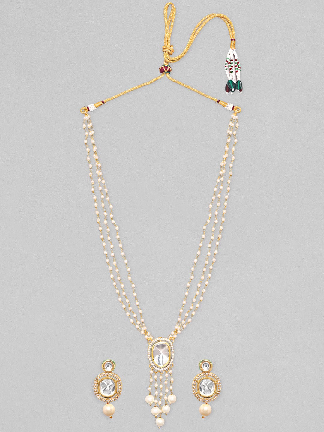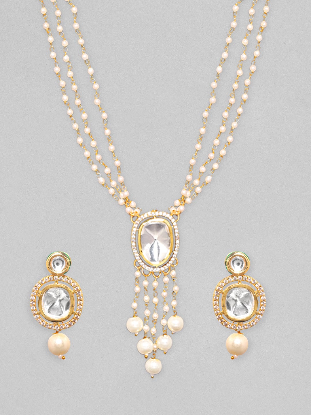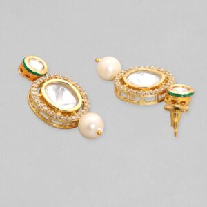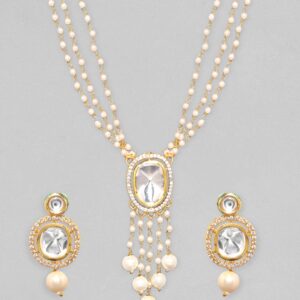 It’s a necklace set for the queens! Exude the royal vibe with gold plated brass, pearl, beads and stones. Occasion : Bring your style to a whole new level with this handcrafted piece of jewellery. When you’re celebrating a special Occasion : – a birthday, wedding, or personal milestone – this piece adds that extra something that makes us feel special and looking our best. Material & Care Dimension : Necklace 27 cm; Earring 3.6 cm: Material : Brass Collection : Kundan Weight : 50g Net Qnty : 1 Necklace, 1 Pair of Earrings Care Label : It is advisable to avoid contact with water and organic chemicals i.e. perfume sprays. Store jewellery in airtight box. After use, wipe the jewellery with soft cotton cloth.