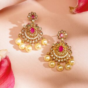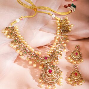 Jewellery Set : A 24K gold-plated handcrafted medium-length temple jewellery set, adorned with ruby pink, emerald green, white cubic zirconia stones, and pearl beads. Ideal for weddings, festive occasions & traditional ceremonies. Occasion : Bring your style to a whole new level with this handcrafted piece of jewelry. When you’re celebrating a weddings, festive occasions & traditional ceremonies, this piece adds that extra something that makes us feel special and looking our best. Material & Care Dimension : Length Size : Necklace : 15 cm, Earrings : 4 cm Dimension : Width : Necklace : 4 cm, Earrings : 2 cm Net Quantity : 1 Necklace & 1 Pair of Earrings Net Weight: 72.75 g Material : Brass Care Label : It is advisable to avoid contact with water and organic chemicals i.e. perfume sprays. Store jewellery in airtight box. After use, wipe the jewellery with soft cotton cloth.