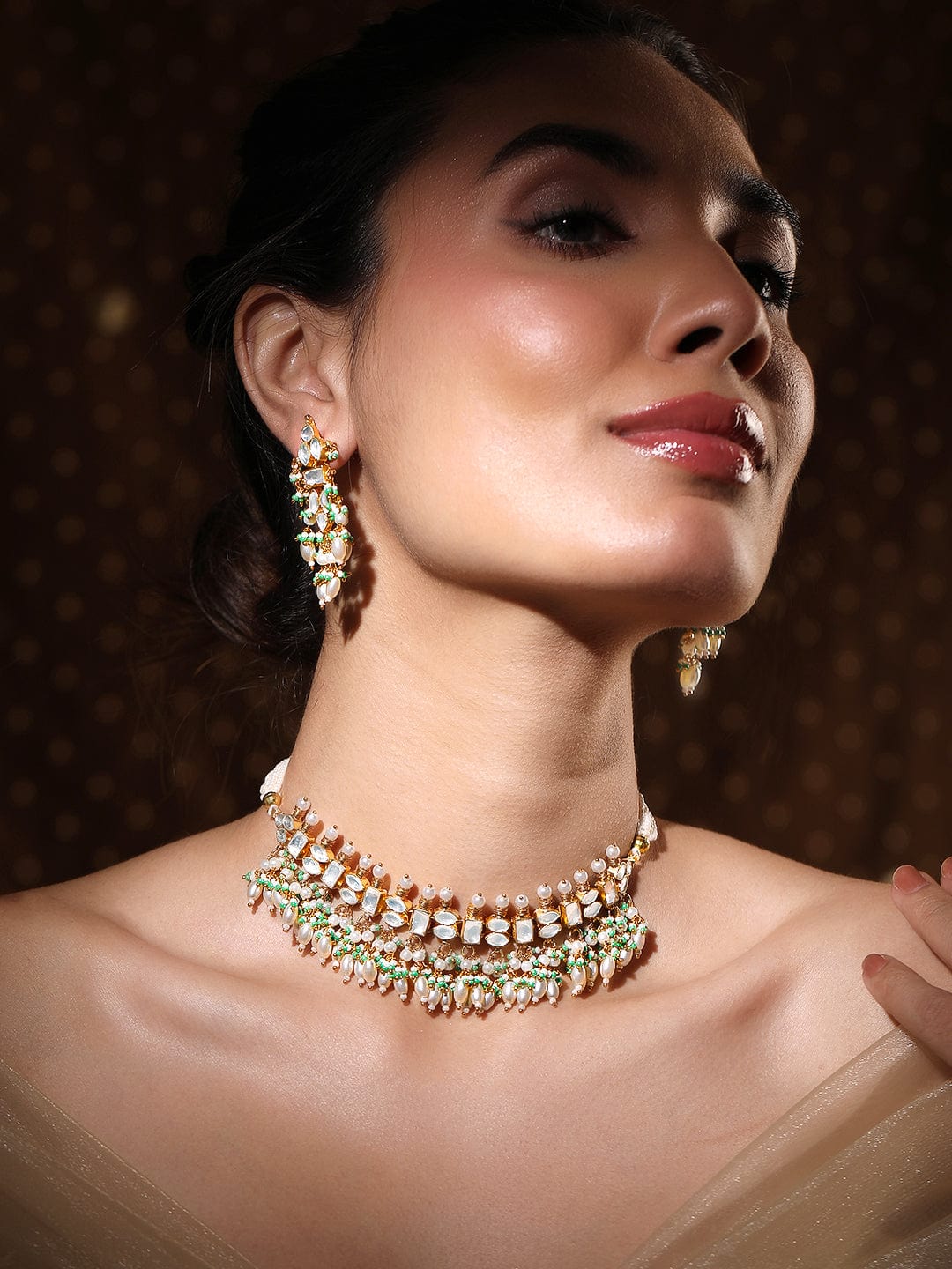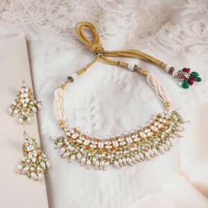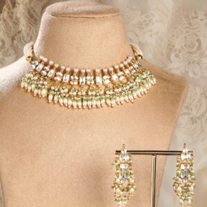 Jewellery Set : This luxurious 24K gold-plated Pachi Kundan necklace and earrings set features intricate craftsmanship adorned with pearl and green bead accents, creating a timeless and regal charm. Occasion : Bring your style to a whole new level with this handcrafted piece of jewellery. When you’re celebrating a special Occasion : – a birthday, wedding, festive or personal milestone – this piece adds that extra something that makes us feel special and looking our best. Material : & Care Dimension :Length : 26 cm / 4 cm, Width: 6 cm / 2 cm Material :Brass Collection : Pachi Kundan Weight : 63.79g Net Qnty : 1 Necklace, 1 Pair of Earrings Care Label : It is advisable to avoid contact with water and organic chemicals i.e. perfume sprays. Store jewellery in airtight box. After use, wipe the jewellery with soft cotton cloth.