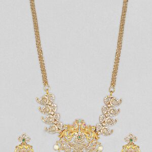 It’s a jewellery set fit for the queens! Exude the royal vibe with this Kundan studded necklace set . Consisting of a necklace, matching earrings, this necklace set is crafted from gold-plated . Occasion : Bring your style to a whole new level with this handcrafted piece of jewellery. When you’re celebrating a special Occasion : – a birthday, wedding, or personal milestone – this piece adds that extra something that makes us feel special and looking our best. Material & Care Dimension : Necklace: 22 cm; Earrings: 5 cm Collection : Rajwadi Gold Material: Brass Net Weight: 40 Gram Net Quantity: 1 Necklace & 1 Pair of Earrings Care Label: It is advisable to avoid contact with water and organic chemicals i.e. perfume sprays. Store jewellery in airtight box. After use, wipe the jewellery with soft cotton cloth.