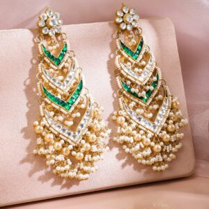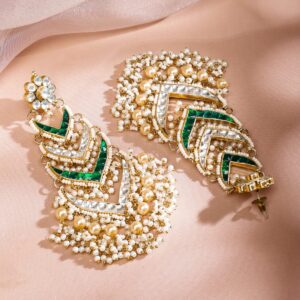 Elevate your elegance with these 24K gold-plated handcrafted shoulder duster earrings, adorned with white Kundan, emerald green accents & layered pearl bead detailing, perfect for weddings & festive occasions. Occasion : Bring your style to a whole new level with this handcrafted piece of jewellery. When you’re celebrating a special Occasion : – a birthday, wedding, or personal milestone – this piece adds that extra something that makes us feel special and looking our best. Material : & Care Dimension : Length : 12 cm, Width: 4 cm Net Weight: 60.54 g Net Quantity : 1 Pair Of Earrings Material :Brass Care Label : It is advisable to avoid contact with water and organic chemicals i.e. perfume sprays. Store jewellery in airtight box. After use, wipe the jewellery with soft cotton cloth.
