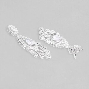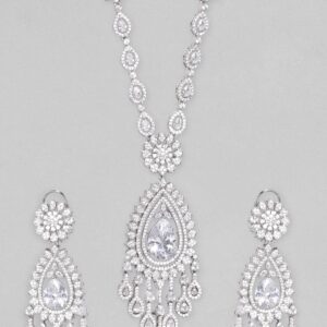 A truly elegant piece, this AD silver necklace is curated with utmost precision to detail. Having a delicate design around the neck and a magnificent pendant at its centre the necklace is a piece of statement jewellery. It comes with lustrous drop earrings that are ideal to carry a bold and sophisticated look. Designed with silver-plated brass and stones, the necklace is all set to make you look like a queen! Occasion- Formal or black-tie events, receptions, dinner parties, and personal milestones are ideal occasions to style this necklace. Material : & Care Dimension : Necklace 25 cm; Earring 5.6 cm: Collection : AD(Silver) Material: Brass Net Weight: 59.89 Gram Net Quantity: 1 Necklace & 1 Pair of Earrings Care Label: It is advisable to avoid contact with water and organic chemicals i.e. perfume sprays. Store jewellery in airtight box. After use, wipe the jewellery with soft cotton cloth.