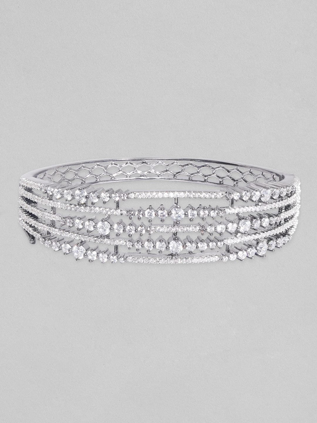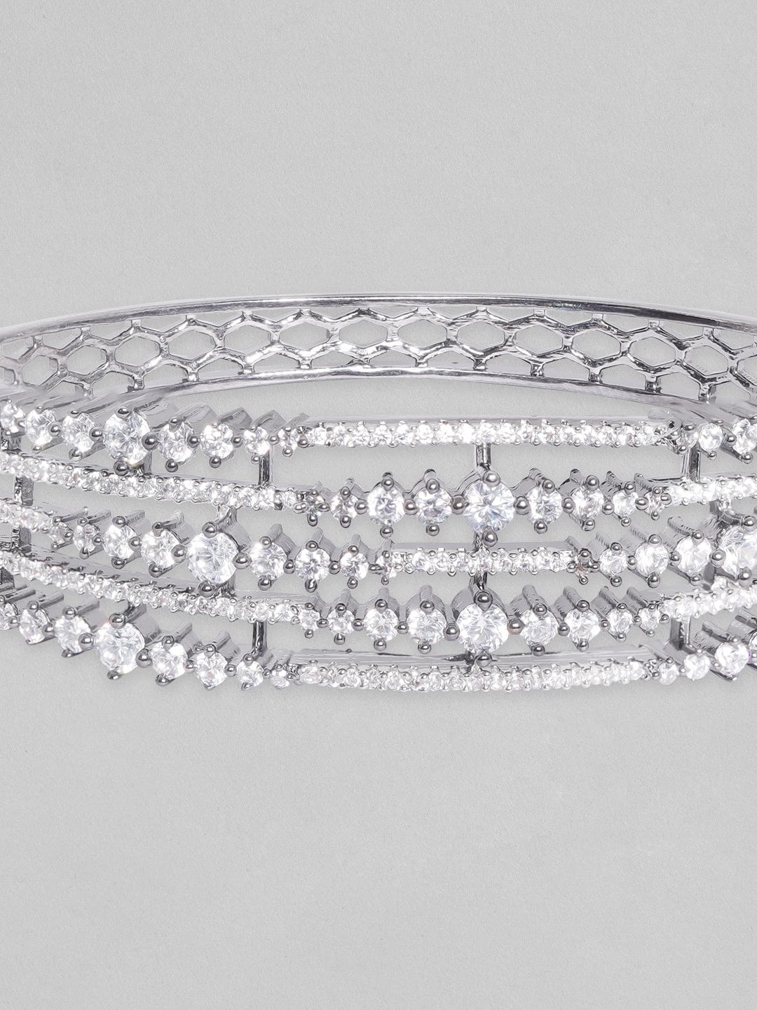 Adorn your wrist with finest rose gold plated bracelets studded with zirconia stones. Pair it up and flaunt with your western attire. Occasion : Bring your style to a whole new level with this handcrafted piece of jewellery. When you’re celebrating a special Occasion : – a birthday, wedding, or personal milestone – this piece adds that extra something that makes us feel special and looking our best. Material & Care Dimension : Adjustable Collection : AD(Silver) Material: Brass Net Weight: 18.18 Gram Net Quantity: 1 Bracelet Care Label: It is advisable to avoid contact with water and organic chemicals i.e. perfume sprays. Store jewellery in airtight box. After use, wipe the jewellery with soft cotton cloth.