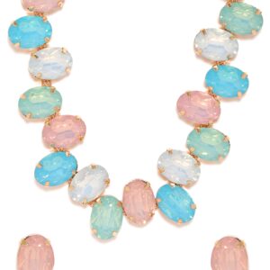 Embark on a journey of enchantment with our “Azure Frontier Magic” multicolored blue stone western necklace set. This captivating ensemble captures the spirit of endless skies and untamed landscapes, featuring a harmonious blend of blue-hued gemstones that evoke the magic of the Western frontier. Material : & Care Dimension : Necklace Length: 20 cm Earrings Length: 2 cm Material : Brass Net Weight : 87.41g Net Qty : 1 Necklace, 1 Pair of Earrings, Care Label : It is advisable to avoid contact with water and organic chemicals i.e. perfume sprays. Store jewellery in airtight box. After use, wipe the jewellery with soft cotton cloth.
