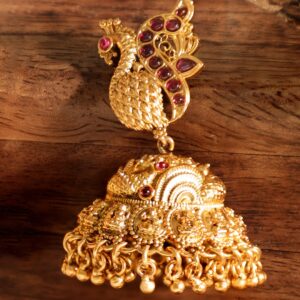 Adorn yourself with the Celestial Plumage of our 22k Gold-Plated Jhumka Earrings, featuring a charming peacock motif. The intricate design and golden allure capture the essence of regality and grace. Elevate your style with these statement earrings, a perfect blend of celestial beauty and opulent charm Material : & Care Dimension : Length 5.5cm; Width 3.3 cm Material : Gold Care Label : It is advisable to avoid contact with water and organic chemicals i.e. perfume sprays. Store jewellery in airtight box. After use, wipe the jewellery with soft cotton cloth.