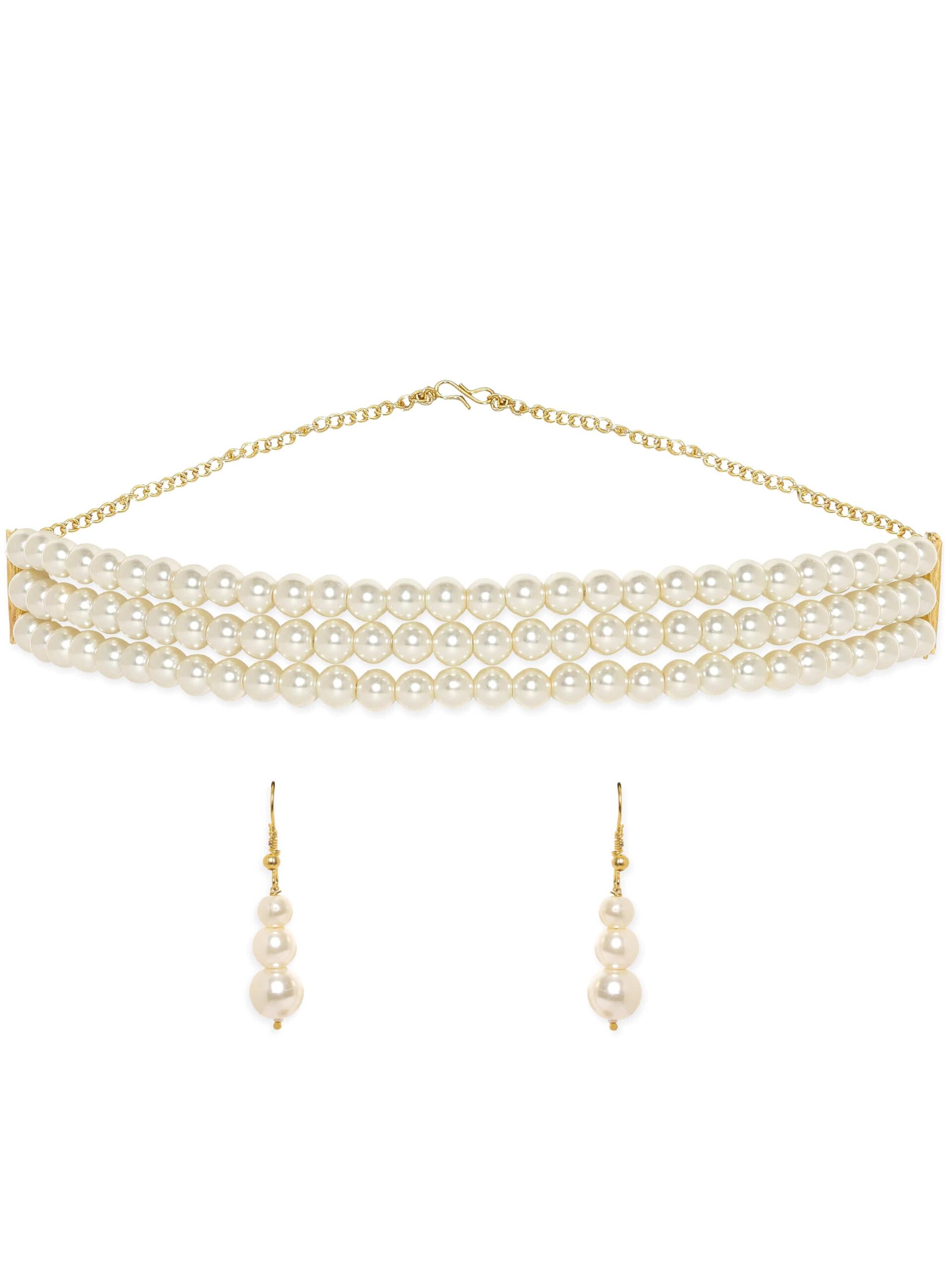 A cream-colored choker necklace set featuring a tri-layer design adorned with lustrous pearl beads. The necklace offers a sophisticated and elegant look with its multiple layers, each showcasing carefully selected pearls in varying sizes. The cream hue of the pearls imparts a classic and versatile aesthetic, suitable for both formal and semi-formal occasions. This set includes matching earrings, completing a refined ensemble that exudes grace and charm, making it a perfect choice for enhancing any outfit. Occasion : Bring your style to a whole new level with this handcrafted piece of jewellery. When you’re celebrating a special Occasion : – a birthday, wedding, or personal milestone – this piece adds that extra something that makes us feel special and looking our best. Material & Care Dimension : Necklace : 46 cm Earrings : 4.5 cm Material : Brass Weight : 121.38g Net Qnty : 1 Necklace, 1 Pair of Earrings Care Label : It is advisable to avoid contact with water and organic chemicals i.e. perfume sprays. Store jewellery in airtight box. After use, wipe the jewellery with soft