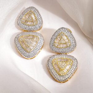 Earrings : These dual-tone drop earrings from feature a striking triangular design, plated with both gold and rhodium. The earrings are studded with AAA crystals and cubic zirconia, offering a dazzling and sophisticated look. Occasion : Bring your style to a whole new level with this handcrafted piece of jewellery. When you’re celebrating a special Occasion : – a birthday, wedding, or personal milestone – this piece adds that extra something that makes us feel special and looking our best. Material : & Care Dimension : Length : 4.5cm, Width: 2.5w Material: Alloy Net Weight: 17 Gram Net Quantity: 1 Pair of Earrings Care Label: It is advisable to avoid contact with water and organic chemicals i.e. perfume sprays. Store jewellery in airtight box. After use, wipe the jewellery with soft cotton cloth.