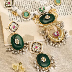 Necklace Set : Discover elegance with the Premium Metal design, meticulously crafted for those who cherish luxury. This piece features precious stones for an eye-catching sparkle, making it perfect for special occasions. With a blend of high-quality materials and exquisite design, it promises both durability and style. The versatile look can complement a variety of outfits, adding a touch of sophistication. A must-have for enhancing your accessory collection with timeless elegance. Occasion : Bring your style to a whole new level with this handcrafted piece of jewellery. When you’re celebrating a special Occasion : – a birthday, wedding, or personal milestone – this piece adds that extra something that makes us feel special and looking our best. Material : & Care Dimension : Length : NS- 42 ; E- 8 cm, Width: NS- 5.5 ; E- 2.5 W Material :Brass Care Label : It is advisable to avoid contact with water and organic chemicals i.e. perfume sprays. Store jewellery in airtight box. After use, wipe the jewellery with soft cotton cloth.