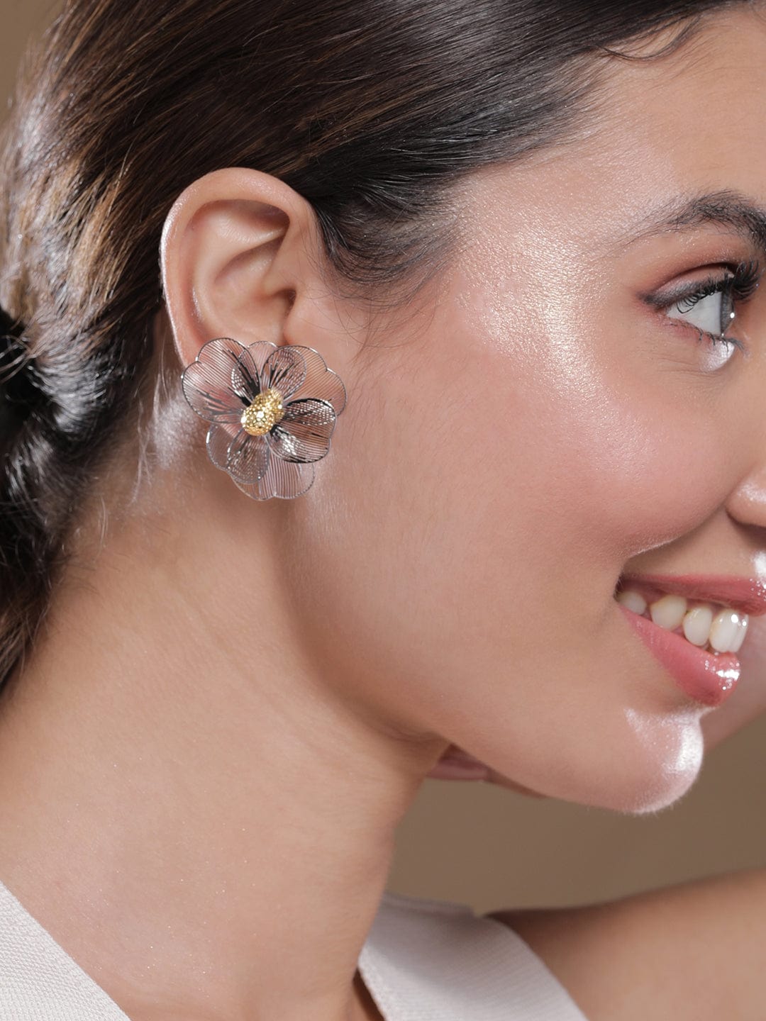 Dual Plating Gold & Silver Floral Design Stud Earrings – Gold