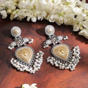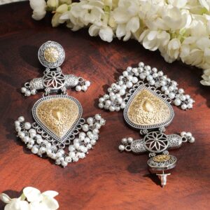 handcrafted dual-tone chandelier earrings feature oxidized silver and gold plating, intricate floral motifs, and cascading pearl-like beads. These timeless earrings exude ethnic elegance for traditional styling. Occasion : Bring your style to a whole new level with this handcrafted piece of jewelry. When you’re celebrating a special Occasion : – a birthday, festive, wedding, or personal milestone – this piece adds that extra something that makes us feel special and looking our best. Material & Care Dimension : Length: 9 cm ; Width : 3 cm Material : Brass Weight: 42.39 gram Net Quantity : 1 Pair of Earrings Care Label : It is advisable to avoid contact with water and organic chemicals i.e. perfume sprays. Store jewelry in airtight box. After use, wipe the jewellery with soft cotton cloth.