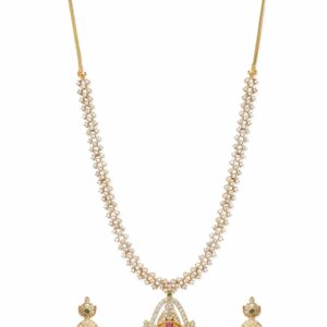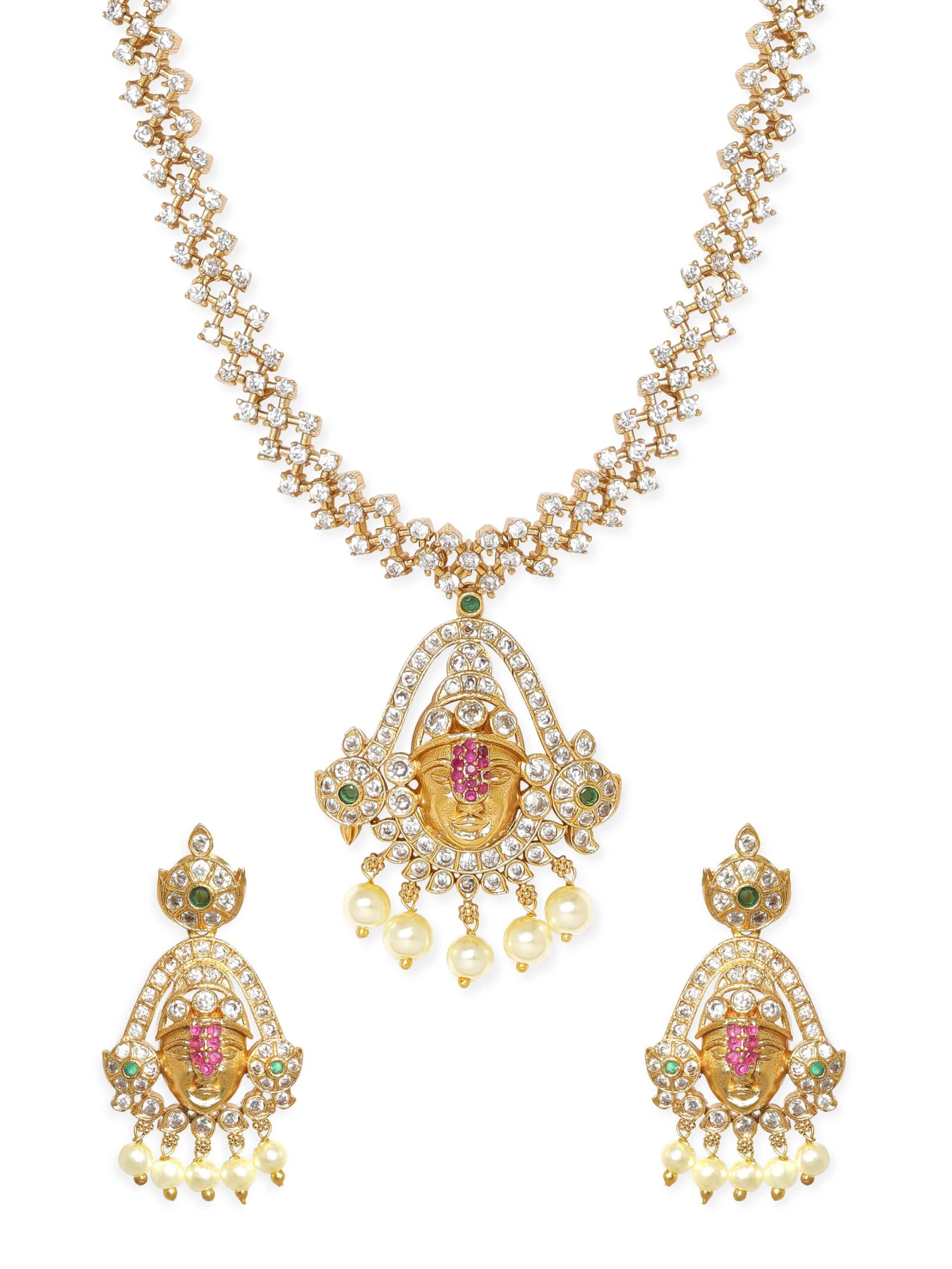 Elevate your style with this exquisite gold-plated AD necklace set. Crafted with precision and adorned with sparkling stones, this set adds a touch of luxury to any outfit. Perfect for special occasions or to make a statement, this necklace set is the epitome of elegance and charm. Material & Care Dimension : Necklace : 17 cm Earrings : 3 cm Material: Brass Net Weight: 39.06 Gram Net Quantity: 1 Necklace & 1 Pair of Earrings Care Label: It is advisable to avoid contact with water and organic chemicals i.e. perfume sprays. Store jewellery in airtight box. After use, wipe the jewellery with soft cotton cloth.