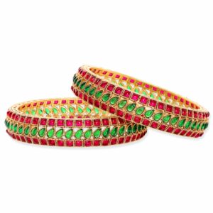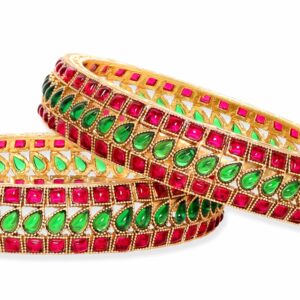 Elevate your traditional attire with the timeless beauty of our exquisite 22K gold-plated Kemp stone bangles. These bangles are a celebration of eternal elegance, featuring intricate craftsmanship and vibrant Kemp stones that add a touch of opulence to your wrists. Occasion : Bring your style to a whole new level with this handcrafted piece of jewellery. When you’re celebrating a special Occasion : – a birthday, wedding, or personal milestone – this piece adds that extra something that makes us feel special and looking our best. Material & Care Material :Brass Collection : Gold Tone Net Weight: 8 Gram Net Quantity: 2 Bangles Care Label : It is advisable to avoid contact with water and organic chemicals i.e. perfume sprays. Store jewellery in airtight box.