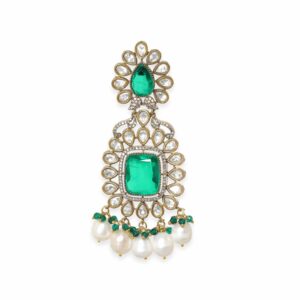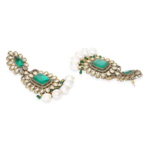 Elevate your style with these exquisite dangle earrings, meticulously crafted with a gold-plated finish and adorned with radiant Kundan stones and vibrant emeralds. Material & Care Dimension :Earrings : 9.5 cm Material : Brass Weight : 57.43g Net Qnty : 1 Pair Earrings Care Label : It is advisable to avoid contact with water and organic chemicals i.e. perfume sprays. Store jewellery in airtight box. After use, wipe the jewellery with sof