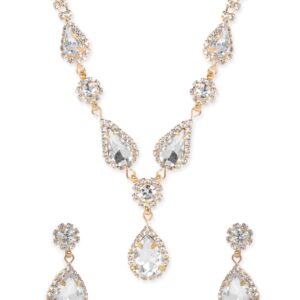“Experience the allure of Gleaming Elegance Gold-Tone Zircon Jewellery Set. Dazzling zircon stones beautifully complement the rich gold tones, creating a captivating and luxurious ensemble. Elevate your look with this set that exudes sophistication and timeless glamour, perfect for special occasions and celebrations.” Material : & Care Dimension : Neckalace : 25 cm Earrings : 3 cm Material : Brass Care Label : It is advisable to avoid contact with water and organic chemicals i.e. perfume sprays. Store jewellery in airtight box. After use, wipe the jewellery with soft cotton cloth.