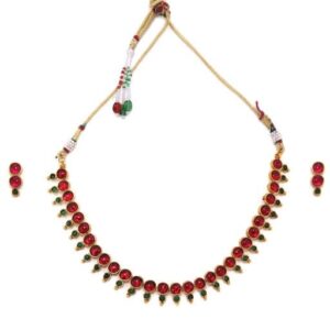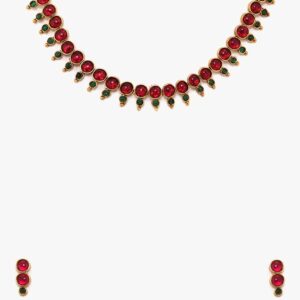 It’s a jewellery set fit for the queens! Exude the royal vibe with this stone studded jewellery set. Consisting of a necklace, matching earrings, this necklace set is crafted from gold-plated brass, stones and beads. Occasion : Bring your style to a whole new level with this handcrafted piece of jewellery. When you’re celebrating a special Occasion : – a birthday, wedding, or personal milestone – this piece adds that extra something that makes us feel special and looking our best. Material : & Care Dimension : Necklace 23 cm, Earrings 2.2 cm Material : Brass Care Label : It is advisable to avoid contact with water and organic chemicals i.e. perfume sprays. Store jewellery in airtight box. After use, wipe the jewellery with soft cotton cloth.