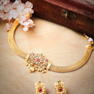 It’s a jewellery set fit for the queens! Exude the royal vibe with this stone studded jewellery set. Consisting of a necklace, matching earrings, this necklace set is crafted from gold-plated brass, stones and beads. Occasion : Bring your style to a whole new level with this handcrafted piece of jewellery. When you’re celebrating a special Occasion : – a birthday, wedding, or personal milestone – this piece adds that extra something that makes us feel special and looking our best. Material & Care Dimension : Choker 21 cm; Earring 3.1 cm Material : Brass Collection : Rajwadi Gold Care Label : It is advisable to avoid contact with water and organic chemicals i.e. perfume sprays. Store jewellery in airtight box. After use, wipe the jewellery with soft cotton cloth