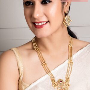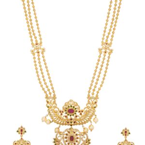 It’s a jewellery set fit for the queens! Exude the royal vibe with this stone studded jewellery set. Consisting of a necklace, matching earrings, this necklace set is crafted from gold-plated brass, stones and beads. Occasion : Bring your style to a whole new level with this handcrafted piece of jewellery. When you’re celebrating a special Occasion : – a birthday, wedding, or personal milestone – this piece adds that extra something that makes us feel special and looking our best. Material : & Care Dimension : Necklace-¬†80 cm ,Earrings -5. cm,¬† Material : ¬†Copper Care Label : It is advisable to avoid contact with water and organic chemicals i.e. perfume sprays. Store jewellery in airtight box. After use, wipe the jewellery with soft cotton cloth